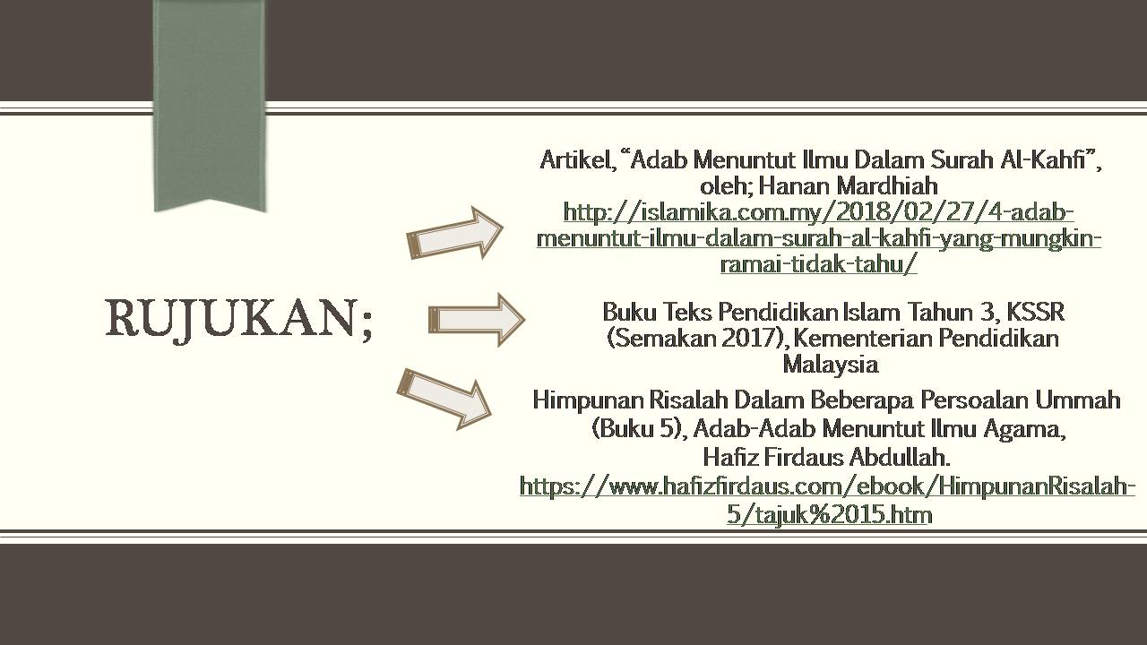 Jurnal : Pengajaran Adab & Akhlak Islam dalam Membangunkan Modal Insan https://archive.org/stream/ADABETIKAMUSLIM/Adab%20Penuntut%20Ilmu#page/n1/mode/2up E-Book : Adab-Adab Penuntut Ilmu